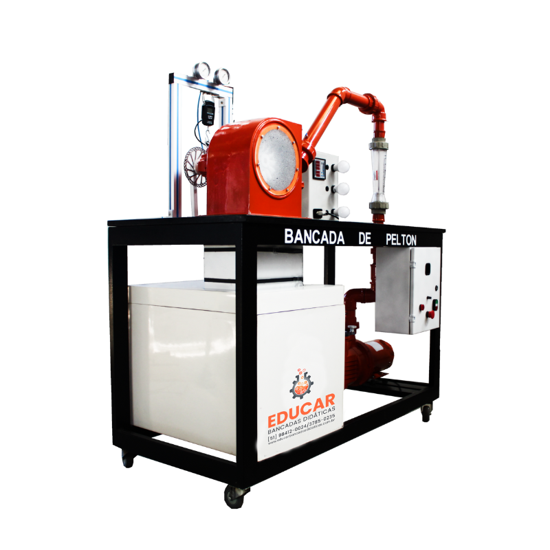 Bancada para simulação de uma Turbina Pelton para auxiliar no estudo de máquinas de fluxo geratrizes, simula as condições geográficas nos quais existem altas quedas e pequenas vazões, características fundamentais para utilização deste tipo de turbina. Possibilita ao usuário fazer o levantamento das variáveis envolvidas, das curvas de potência e rendimento da turbina em diferentes combinações de altura de quedas d’água e de vazões volumétricas por meio da constrição do jato d’água (bico injetor) móvel que direciona um jato de água através de um bocal para as pás da turbina, inserindo força para fazê-la girar.